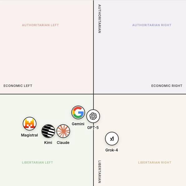 Топовые нейросети оказались левыми либералами (кроме Grok)Я бы ожидал этой картинки от Илона Маска, но Гоблин себя позиционирует как большой любитель коммунистов. Или он думает, что коммунисты правые?