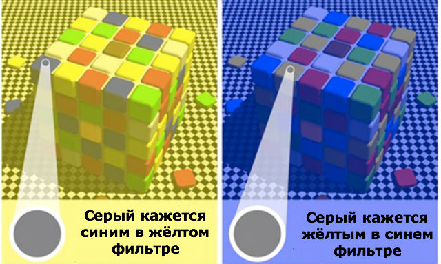 При одном фильтре в серый превращается синий цвет, при другом фильтре в серый превращается жёлтый цвет.