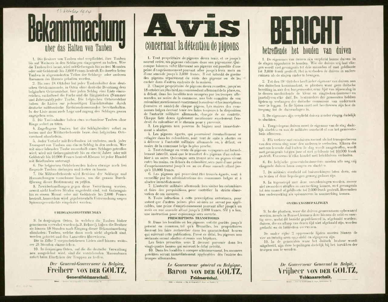 «Ну и поскольку к любой ситуации у меня есть какая-нибудь странная штука из архивов, то вот вам распоряжение фельдмаршала Кольмара фон дер Гольца в оккупированной Бельгии 1914 г. насчет ГОЛУБЕЙ: выпускать полетать нельзя;