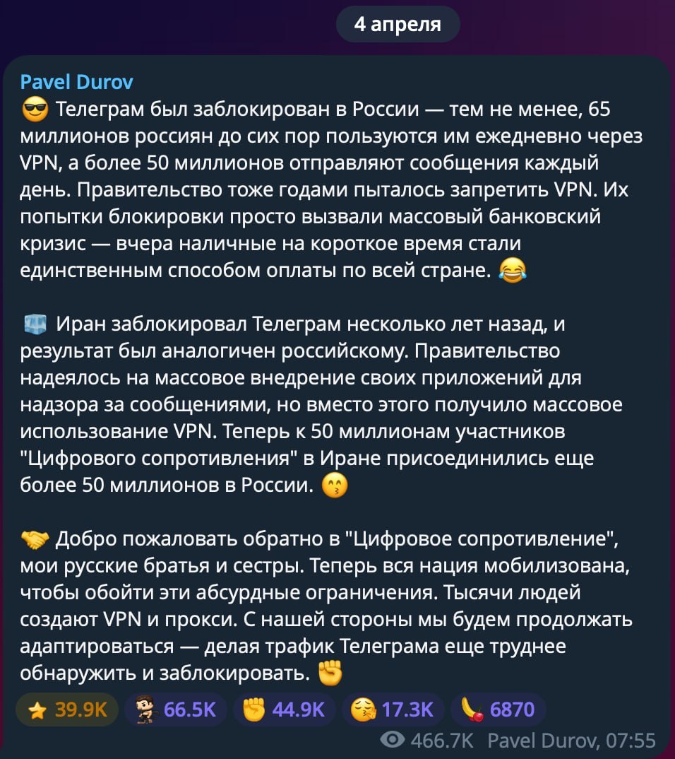более того, они продолжат сидеть в телеграмме через ВПН даже если для простых смертных это будет криминализовано  :)